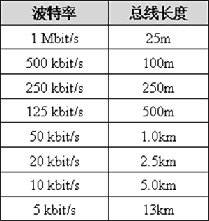 注意:CAN總線電纜可以使用普通雙絞線、屏蔽雙絞線。理論最大通信距離主要取決于總線波特率,最大總線長度和波特率關(guān)系詳見下表。若通訊距離超過1Km,應(yīng)保證線的截面積大于Φ1.0mm2,具體規(guī)格應(yīng)根據(jù)距離而定,常規(guī)是隨距離的加長而適當(dāng)加大。