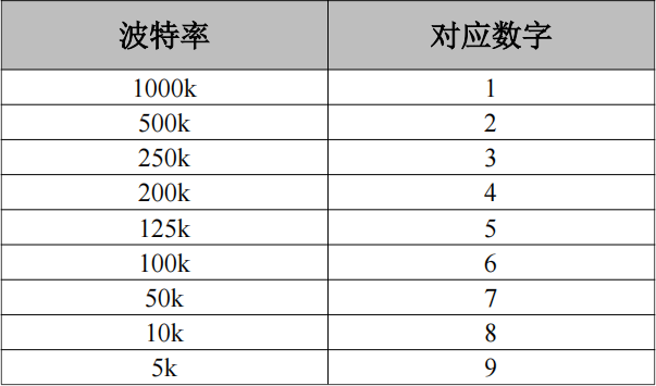 “Can Baudrate”——設(shè)置CAN端波特率;詳細(xì)設(shè)置如表所示RS485波特率與對應(yīng)數(shù)字對照表
