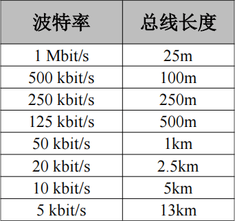 波特率與最大總線長度參照表