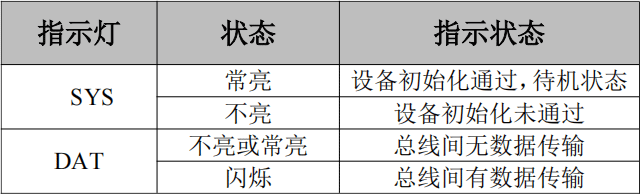 GCAN-205模塊具有1個SYS指示燈,用來指示設(shè)備的運行狀態(tài),1個DAT指示燈,用來指示數(shù)據(jù)傳輸。這2個指示燈的具體指示功能見下表,這2個指示燈處于各種狀態(tài)下時,CAN總線的狀態(tài)如表所示。GCAN-205模塊指示燈