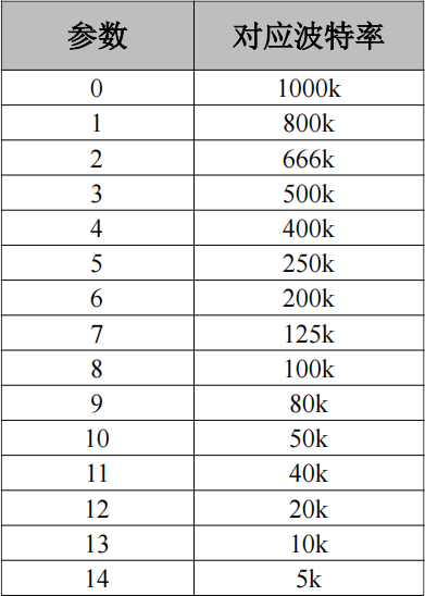 “CAN Baudrate”可設(shè)置CAN總線的波特率,需按表填寫,對應(yīng)表如下:波特率參數(shù)對照表