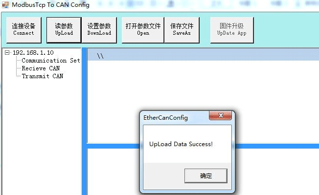 3、連接后軟件界面左面的欄中會顯示連接設(shè)備的設(shè)置列表,這時可以點擊“讀參數(shù)Upload”將設(shè)備中的參數(shù)上載到電腦。上載成功后會有如下圖信息顯示。配置軟件讀參數(shù)成功