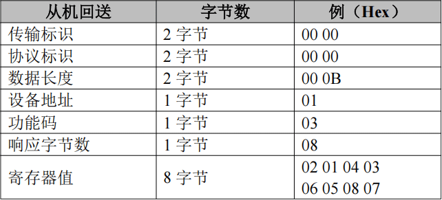例如:配置Modbus從站地址為1,Modbus寄存器首地址為0x01(出廠預(yù)設(shè)值),功能碼為03,CAN為標(biāo)準(zhǔn)幀,幀ID為0x181,CAN幀數(shù)據(jù)為0x01,0x02,0x03,0x04,0x05,0x06,0x07,0x08。用戶Modbus主站發(fā)送請求幀:00 00 00 00 00 06 01 03 00 01 00 04GCAN-205的響應(yīng)幀:00 00 00 00 00 0B 01 03 08 02 01 04 03 06 05 08 07