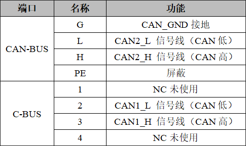 GCAN-GT-412模塊CAN-bus接口由2個4 Pin接線端子引出,可以用于連接2個CAN-bus網(wǎng)絡(luò)或者CAN-bus接口的設(shè)備,其接口定義如表所示。