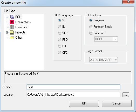為項(xiàng)目添加文件(例如:添加ST語言編寫的程序頁ST,Program),如圖所示。請注意,Name(名稱)一欄中填入的字符串不能以數(shù)字為開頭。