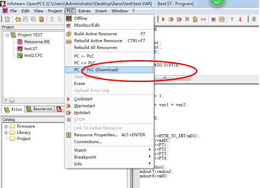 4、在下拉菜單中點(diǎn)擊PC->PLC(Download)下載程序。