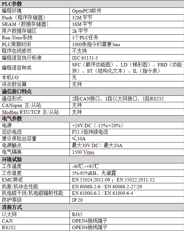 (1)高速的32位工業(yè)級處理器;(2)內(nèi)嵌硬件看門狗定時器;(3)使用外接電源供電(DC+24V,100mA);(4)靜電放電抗擾度等級:接觸放電±2KV,空氣放電±8KV;(5)電快速瞬變脈沖群抗擾度等級:±1KV;(6)浪涌抗擾度等級:±1KV;(7)工作濕度范圍:5%~95%RH無凝露;(8)2路CAN總線接口,1路以太網(wǎng)接口,1路RS232串行接口;(9)編程軟件:OpenPCS(符合IEC 61131-3標(biāo)準(zhǔn));(10)支持CANopen協(xié)議主/從站功能;(11)支持Modbus RTU/TCP主/從站功能;(12)標(biāo)準(zhǔn)DIN導(dǎo)軌安裝方式,專為工業(yè)設(shè)計。(13)電氣隔離為1500 Vrms;(14)工作溫度范圍:-40℃~+85℃;(15)防護(hù)等級:IP20;
