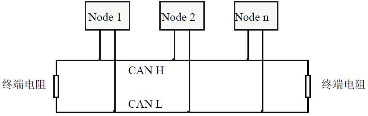 為了增強CAN通訊的可靠性,消除CAN總線終端信號反射干擾,CAN總線網(wǎng)絡(luò)最遠的兩個端點通常要加入終端匹配電阻,如圖所示。終端匹配電阻的值由傳輸電纜的特性阻抗所決定。例如雙絞線的特性阻抗為120Ω,則總線上的兩個端點也應(yīng)集成120Ω終端電阻。如果網(wǎng)絡(luò)上其他節(jié)點使用不同的收發(fā)器,則終端電阻須另外計算。