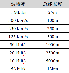 波特率與最大總線長度參照表
