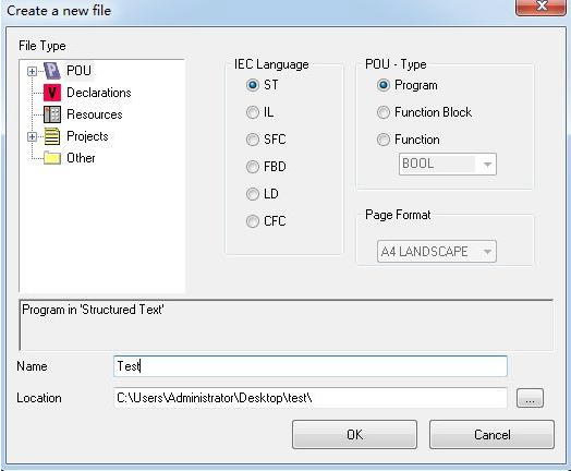 為項目添加文件(例如:添加ST語言編寫的程序頁ST,Program),如圖所示。請注意,Name(名稱)一欄中填入的字符串不能以數(shù)字為開頭。