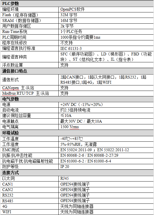(1)高速的32位工業(yè)級處理器;(2)內(nèi)嵌硬件看門狗定時器;(3)使用外接電源供電(DC+24V,100mA);(4)靜電放電抗擾度等級:接觸放電±2KV,空氣放電±8KV;(5)電快速瞬變脈沖群抗擾度等級:±1KV;(6)浪涌抗擾度等級:±1KV;(7)工作濕度范圍:5%~95%RH無凝露;(8)2路CAN總線接口、1路以太網(wǎng)總線接口、1路RS485總線接口、1路RS232總線接口,1路4G接口、1路WIFI接口。(9)編程軟件:OpenPCS(符合IEC 61131-3標(biāo)準(zhǔn));(10)支持CANopen協(xié)議主/從站功能;(11)支持Modbus TCP主/從站功能;(12)標(biāo)準(zhǔn)DIN導(dǎo)軌安裝方式,專為工業(yè)設(shè)計。(13)電氣隔離為1500 Vrms;(14)工作溫度范圍:-40℃~+85℃;(15)防護等級:IP20。