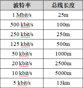 請注意:CAN-bus電纜可以使用普通雙絞線、屏蔽雙絞線。理論最大通信距離主要取決于總線波特率,最大總線長度和波特率關系詳見下表。若通訊距離超過1km,應保證線的截面積大于Φ1.0mm2,具體規(guī)格應根據(jù)距離而定,常規(guī)是隨距離的加長而適當加大。