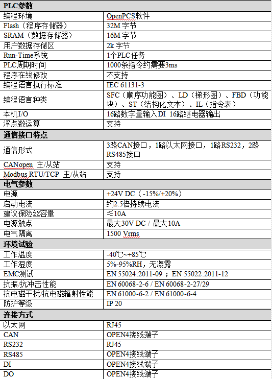(1)高速的32位工業(yè)級處理器;(2)內(nèi)嵌硬件看門狗定時器;(3)使用外接電源供電(DC+24V,100mA);(4)靜電放電抗擾度等級:接觸放電±2KV,空氣放電±8KV;(5)電快速瞬變脈沖群抗擾度等級:±1KV;(6)浪涌抗擾度等級:±1KV;(7)工作濕度范圍:5%~95%RH無凝露;(8)3路CAN總線接口,1路以太網(wǎng)接口,1路RS232串行接口、2路RS485串行接口;(9)編程軟件:OpenPCS(符合IEC 61131-3標準);(10)支持CANopen協(xié)議主/從站功能;(11)支持Modbus TCP主/從站功能;(12)標準DIN導軌安裝方式,專為工業(yè)設計。(13)電氣隔離為1500 Vrms;(14)工作溫度范圍:-40℃~+85℃;(15)防護等級:IP20。