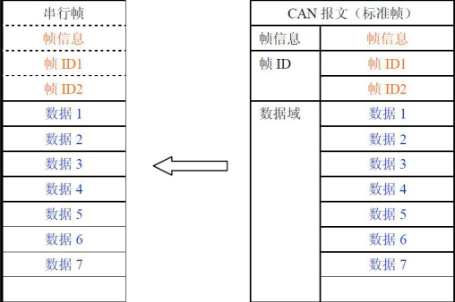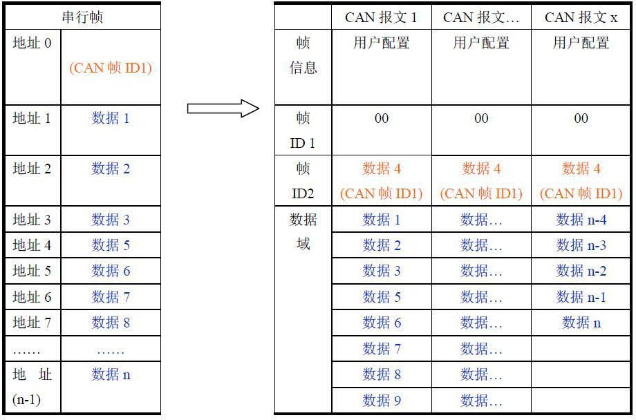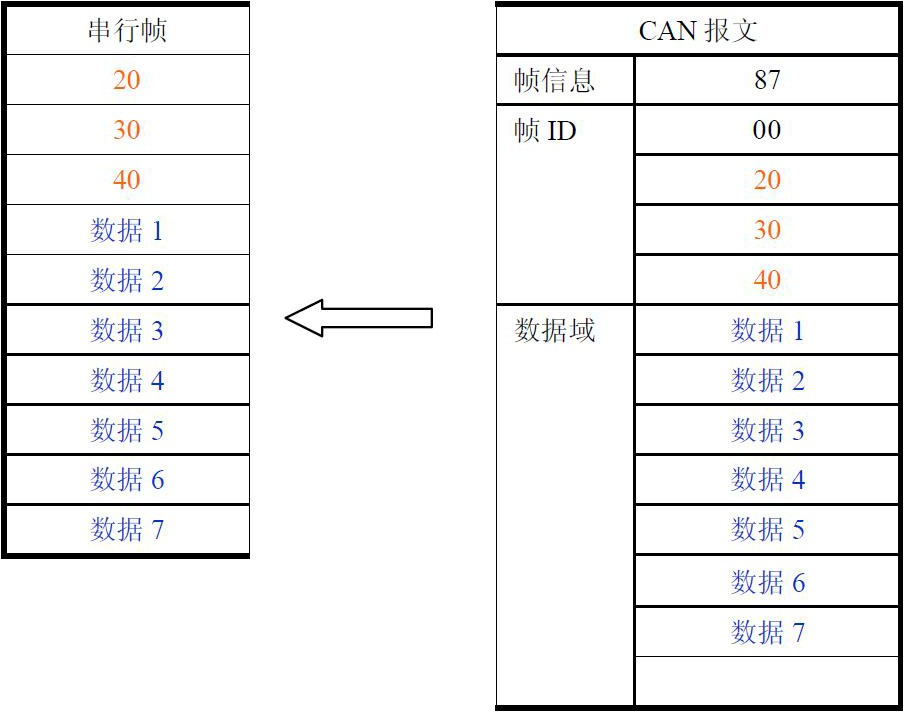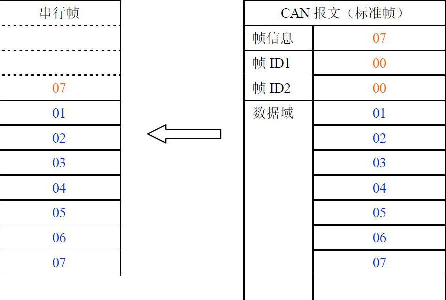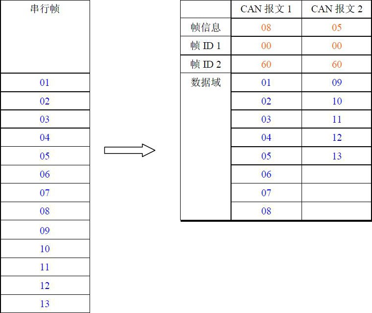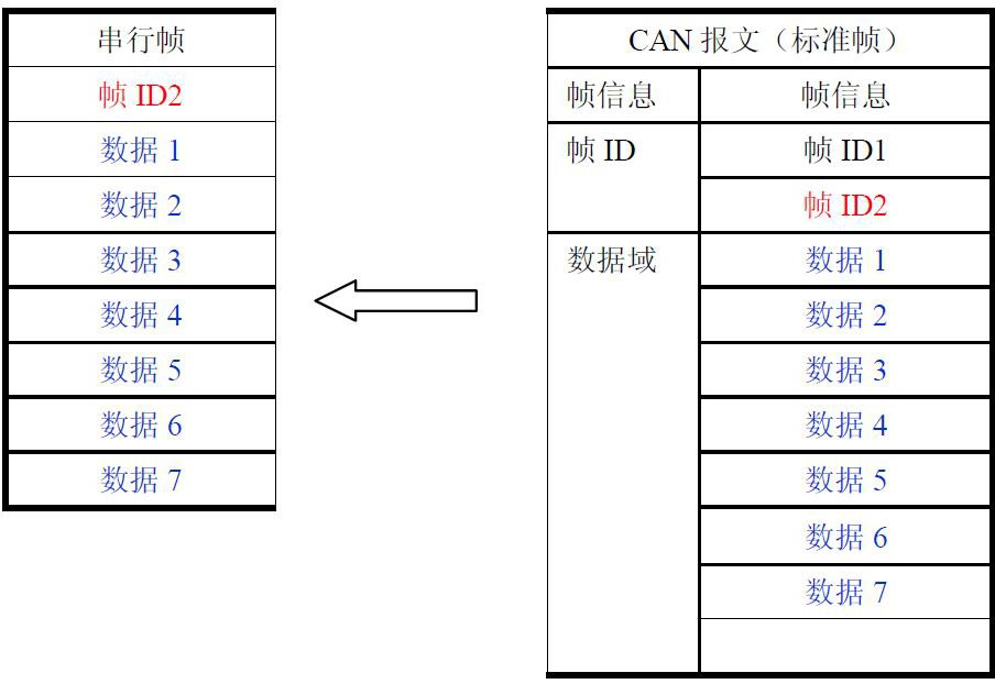 CAN報文的格式不變,只是CAN相應的幀ID也會被轉(zhuǎn)換到串行幀中。(2)轉(zhuǎn)換方式