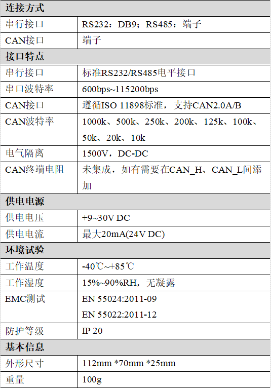● 一般情況下CAN波特率應該是串口波特率的3倍左右,數(shù)據(jù)傳輸會比較均勻(因為在CAN總線傳輸數(shù)據(jù)的時候還附加了其他的功能域,相當于增加了數(shù)據(jù)的長度,所以相同波特率下CAN傳輸?shù)臅r間會比串行總線的時間長)。九、技術(shù)規(guī)格