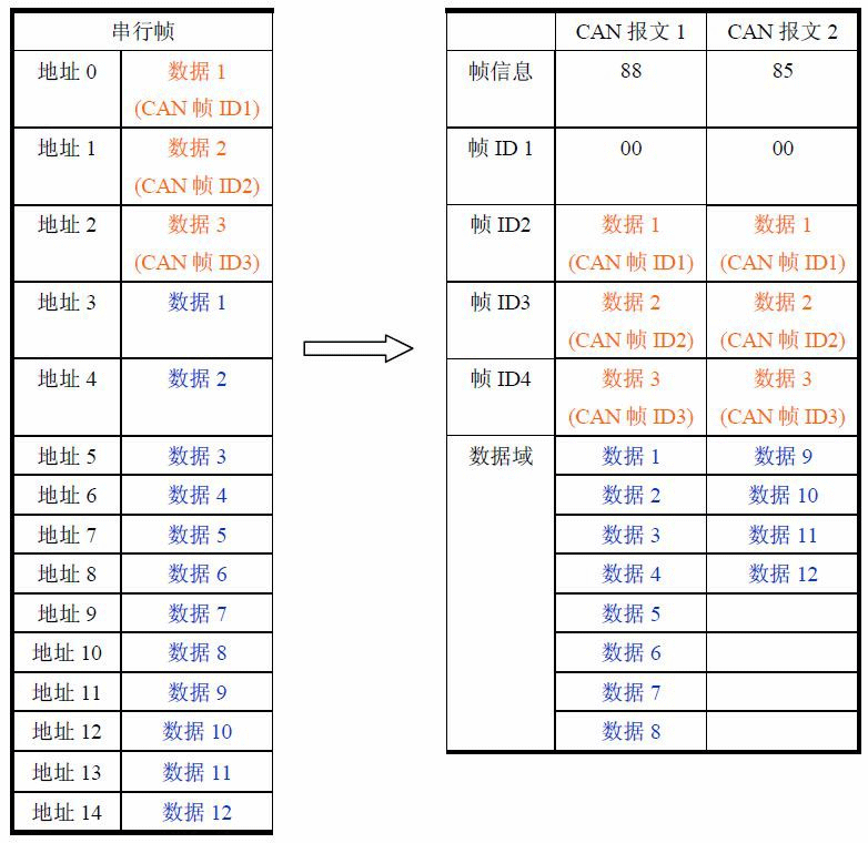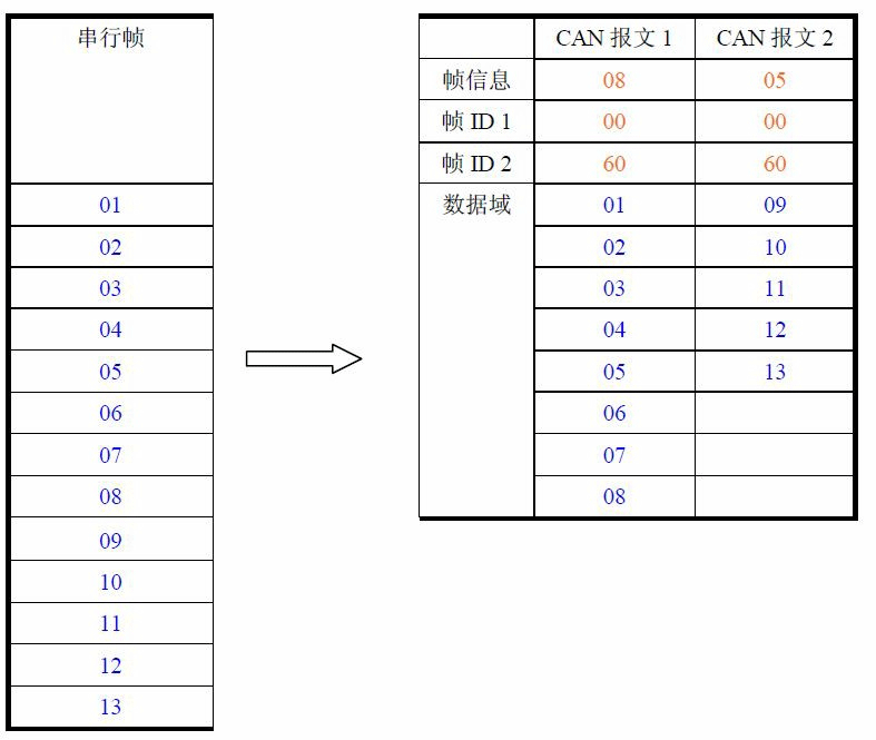 CAN報(bào)文的格式不變,只是CAN相應(yīng)的幀ID也會(huì)被轉(zhuǎn)換到串行幀中。(2)轉(zhuǎn)換方式