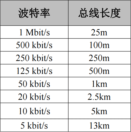 注意:CAN總線電纜可以使用普通雙絞線、屏蔽雙絞線。理論最大通信距離主要取決于總線波特率,最大總線長(zhǎng)度和波特率關(guān)系詳見(jiàn)下表。若通訊距離超過(guò)1km,應(yīng)保證線的截面積大于Φ1.0mm2,具體規(guī)格應(yīng)根據(jù)距離而定,常規(guī)是隨距離的加長(zhǎng)而適當(dāng)加大。