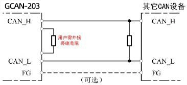 請(qǐng)注意:GCAN-203模塊內(nèi)部未集成120Ω終端電阻。如需連接時(shí),請(qǐng)將120Ω電阻并聯(lián)接入CAN_H與CAN_L接口。
