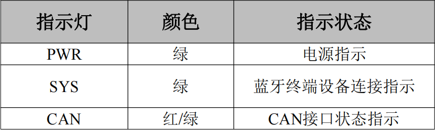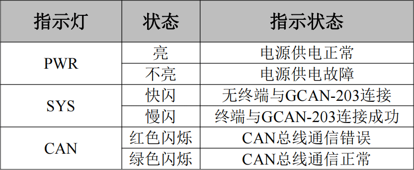 GCAN-203模塊具有1個(gè)PWR指示燈、1個(gè)SYS指示燈、1個(gè)CAN指示燈來(lái)指示設(shè)備的運(yùn)行狀態(tài)。這3個(gè)指示燈的具體指示功能見(jiàn)下表,這3個(gè)指示燈處于不同狀態(tài)下時(shí),設(shè)備狀態(tài)如下表所示。GCAN-203模塊指示燈