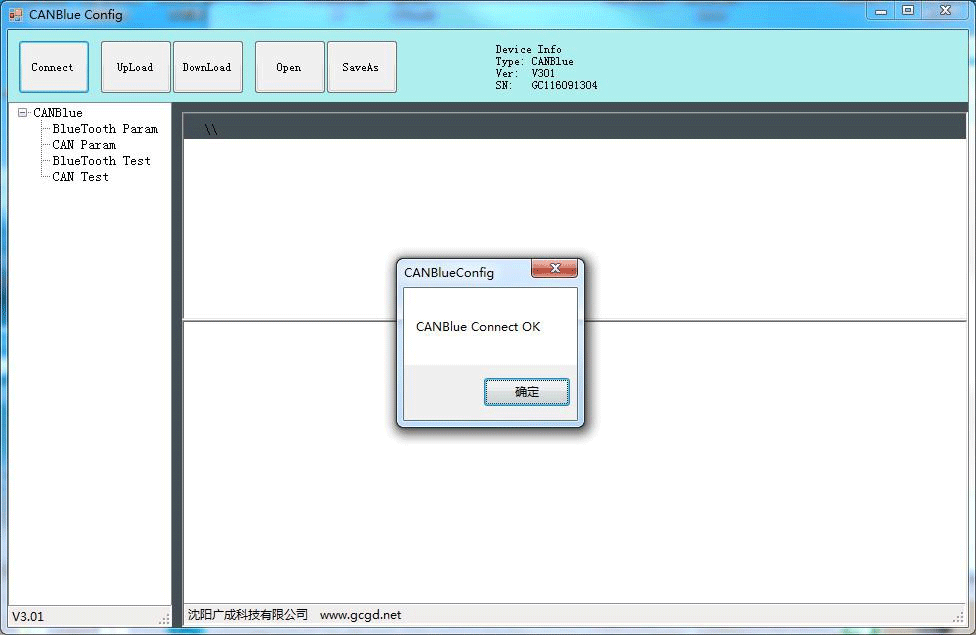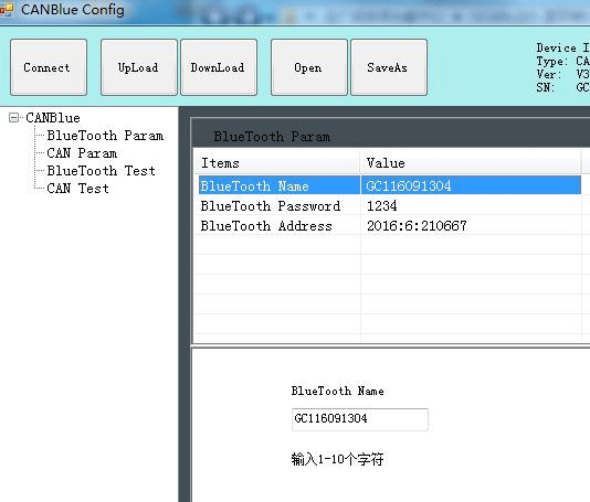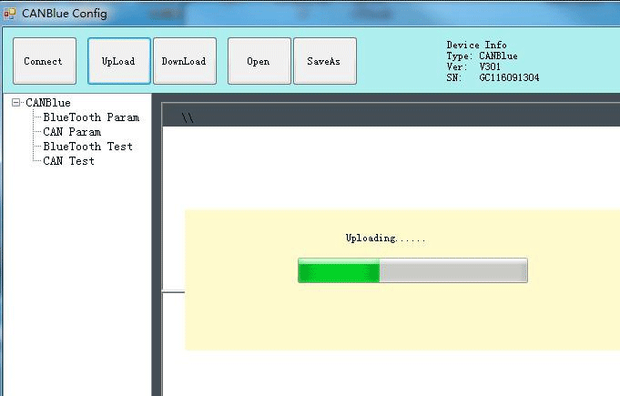 連接成功后軟件界面左面的欄中會(huì)顯示連接設(shè)備的設(shè)置列表,這時(shí)可以點(diǎn)擊“UpLoad”將設(shè)備中的參數(shù)上載到電腦。CANBlueConfig軟件上載參數(shù)