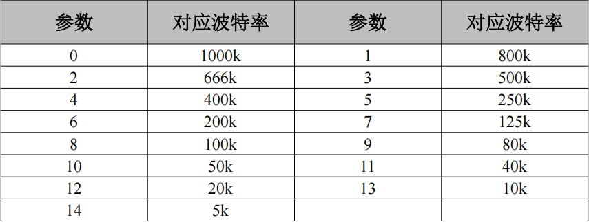 點(diǎn)擊“CAN Param”一行進(jìn)入CAN總線通信參數(shù)設(shè)置。在界面下方“CANBaud”右側(cè)的對(duì)話框中改變輸入?yún)?shù)的值即可實(shí)現(xiàn)配置CAN總線的波特率,其對(duì)應(yīng)表如表所示。CAN波特率對(duì)應(yīng)表