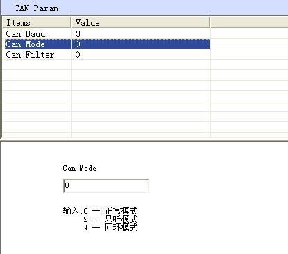 點(diǎn)擊“CAN Mode”一行進(jìn)入CAN通道工作模式設(shè)置。在界面下方“CAN Mode”右側(cè)的對(duì)話框中改變輸入?yún)?shù)的值即可實(shí)現(xiàn)配置CAN通道工作方式,其中參數(shù)“0”代表正常工作模式,參數(shù)“2”代表只聽(tīng)模式,參數(shù)“4”代表回環(huán)模式。