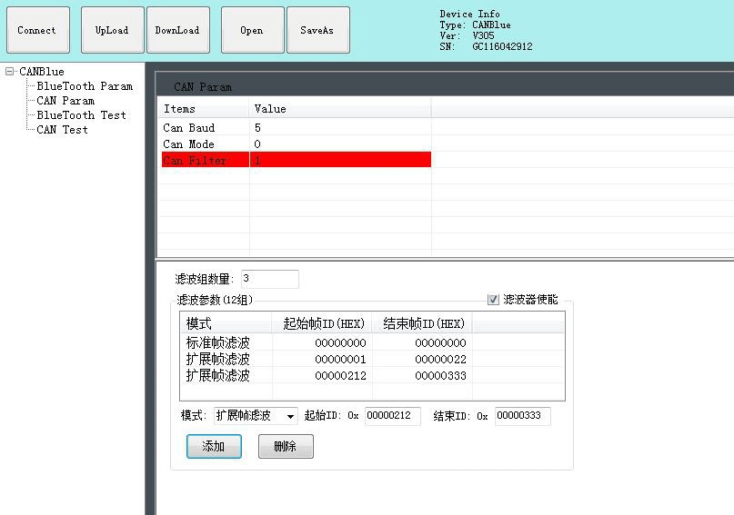 若濾波器功能生效,“CAN Filter”值顯示為1,否則為0。“CAN Param”設(shè)置完成后,若不再進(jìn)行“BlueTooth Param”設(shè)置,需點(diǎn)擊頁(yè)面上方“Download”按鈕使設(shè)置生效。CAN濾波模式設(shè)置