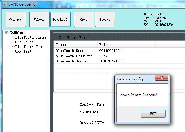 設(shè)備使用前需根據(jù)用戶(hù)具體實(shí)際情況對(duì)GCAN-203模塊進(jìn)行工作參數(shù)配置,使用CANBlueConfig軟件可對(duì)該模塊配置的參數(shù)包括:CAN總線波特率、CAN總線工作模式、GCAN-203藍(lán)牙名稱(chēng)、GCAN-203連接密碼等。GCAN-203設(shè)備出廠默認(rèn)CAN總線波特率為1000k,工作模式為正常模式,藍(lán)牙名稱(chēng)為設(shè)備背面的SN編號(hào),連接密碼1234。