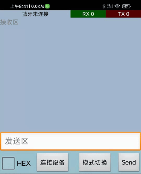 識(shí)別到對(duì)應(yīng)設(shè)備后,成功后進(jìn)入接收/發(fā)送數(shù)據(jù)界面,如下圖所示。藍(lán)牙串口軟件主界面