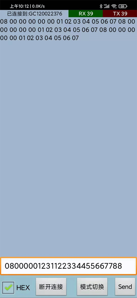注意:使用藍(lán)牙串口助手軟件收發(fā)數(shù)據(jù)時(shí),請(qǐng)您選擇16進(jìn)制發(fā)送和接收。勾選“HEX”按鈕設(shè)置16進(jìn)制收發(fā),如果您的手機(jī)接收到了ASCII碼類(lèi)型的數(shù)據(jù),請(qǐng)通過(guò)勾選“HEX”按鈕進(jìn)行修改。使用GCAN-203設(shè)備發(fā)送數(shù)據(jù)時(shí),您不需要輸入空格,軟件會(huì)自動(dòng)區(qū)分?jǐn)?shù)據(jù)的字節(jié),如果您發(fā)送數(shù)據(jù)時(shí)字節(jié)數(shù)大于13個(gè)字節(jié),軟件將自動(dòng)過(guò)濾多出的字節(jié),只識(shí)別前13個(gè)字節(jié)。發(fā)送和接收數(shù)據(jù)如下圖所示。(4)藍(lán)牙串口助手收發(fā)數(shù)據(jù)舉例說(shuō)明