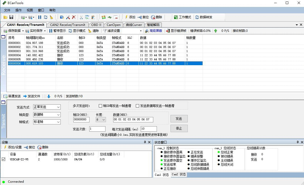 如圖所示,左側(cè)粉紅色設(shè)備為USBCAN-II Pro分析儀,它可以用于收發(fā)CAN總線數(shù)據(jù)、保存分析CAN總線數(shù)據(jù)、識(shí)別CAN設(shè)備波特率等。在本章中,我們將使用USBCAN-II Pro分析儀作為一個(gè)CAN節(jié)點(diǎn),與已連接GCAN-203設(shè)備的智能手機(jī)進(jìn)行通信。接線及終端電阻確認(rèn)無(wú)誤后,開(kāi)啟ECANtools軟件,調(diào)用USBCAN-II Pro設(shè)備,選擇波特率為1000k,備用。