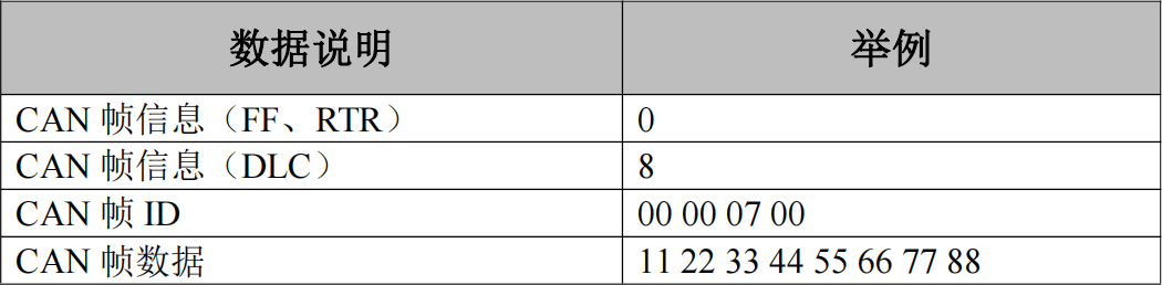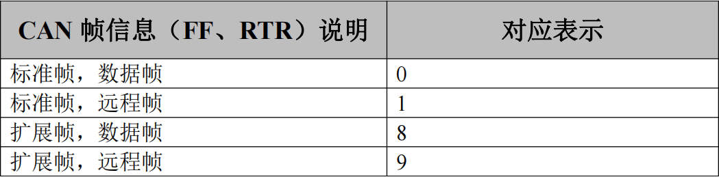 下面對(duì)接收/發(fā)送的數(shù)據(jù)格式進(jìn)行簡(jiǎn)要的介紹。其中,CAN幀信息(FF、RTR)表示該CAN幀的幀格式與幀類(lèi)型,具體數(shù)值如下表所示;CAN幀信息(DLC)表示該CAN幀幀數(shù)據(jù)的字節(jié)長(zhǎng)度,可按實(shí)際需求填0~8數(shù)字。