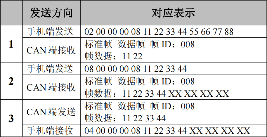 當(dāng)手機(jī)端向CAN端發(fā)送數(shù)據(jù)時(shí),若您發(fā)送的數(shù)據(jù)CAN幀信息(DLC)小于您實(shí)際發(fā)送的幀數(shù)據(jù)字節(jié)數(shù)時(shí),CAN端將按照您DLC聲明的幀數(shù)據(jù)字節(jié)數(shù)來(lái)接收。