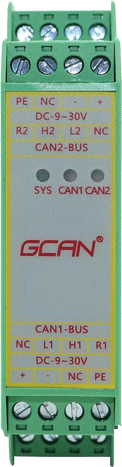 GCAN-226模塊集成2路DC 9-30V電源接口、2路標(biāo)準(zhǔn)CAN總線接口,CAN總線自帶120Ω終端電阻,可通過連線接入。GCAN-226模塊接線端子如圖所示。