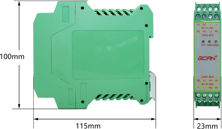 設(shè)備外形尺寸:(長,含接線端子)115mm*(寬)23mm*(高)100mm,其示意圖如圖所示。