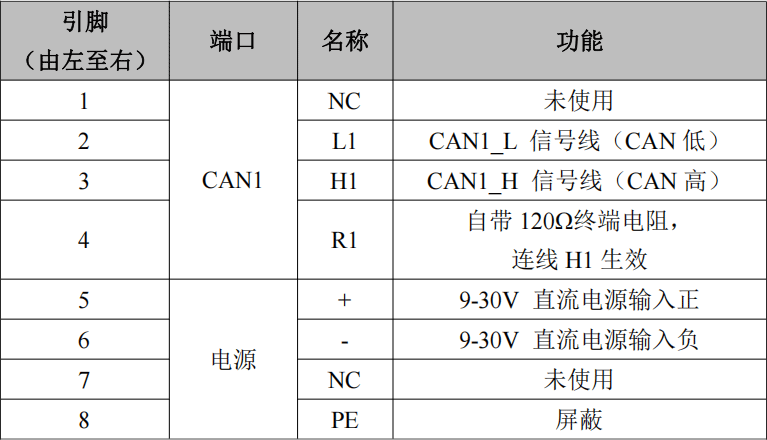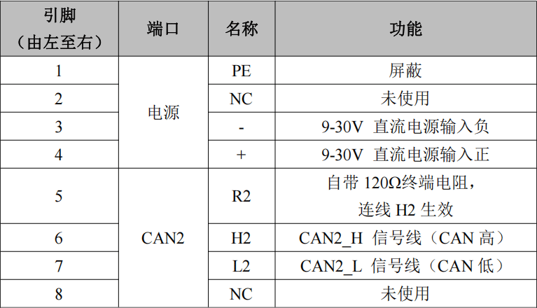 GCAN-226模塊的上方為電源接口和CAN2接口。電源接口由1個(gè)4 PIN插拔式接線端子引出(綠色),CAN總線接口由一個(gè)4 PIN插拔式接線端子引出(綠色),電源接口及CAN2總線接口位置、接口定義如圖所示。