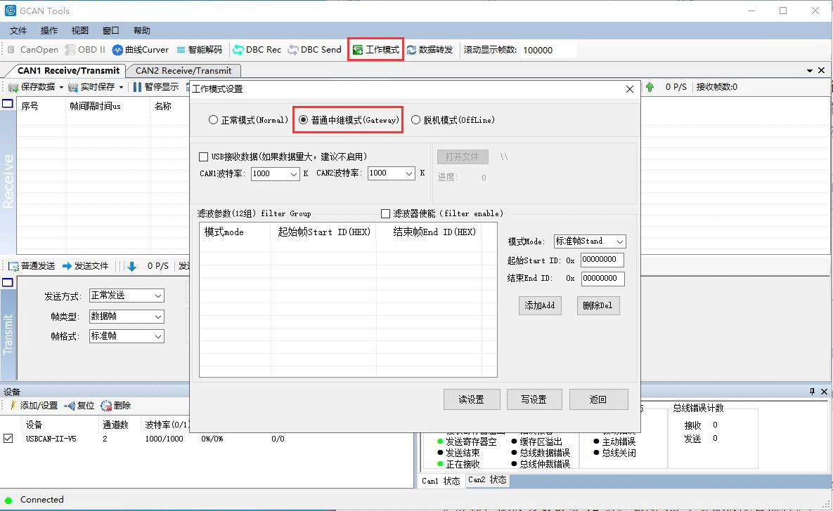 CAN中繼功能可將2條波特率相同或不同的CAN總線數(shù)據(jù)進(jìn)行相互轉(zhuǎn)發(fā)。您可通過點(diǎn)選“工作模式”——“普通中繼模式”——“設(shè)置CAN1和CAN2的波特率”——“寫設(shè)置”來設(shè)置GCAN-226的工作模式。操作流程如圖所示。