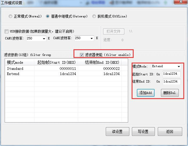勾選濾波器使能,添加Add,使用中繼濾波功能??梢酝瑫r(shí)設(shè)置標(biāo)準(zhǔn)幀或者擴(kuò)展幀,濾波參數(shù)最多12組。如圖中繼濾波配置流程。