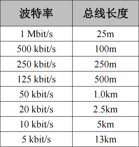請注意:CAN總線電纜可以使用普通雙絞線、屏蔽雙絞線。理論最大通信距離主要取決于總線波特率,最大總線長度和波特率關(guān)系詳見表。若通訊距離超過1Km,應(yīng)保證線的截面積大于Φ1.0mm2,具體規(guī)格應(yīng)根據(jù)距離而定,常規(guī)是隨距離的加長而適當(dāng)加大。