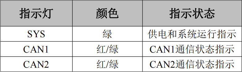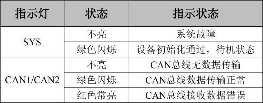 GCAN-226系列模塊具有1個(gè)PWR指示燈用來情況,1個(gè)SYS指示燈用來指示系統(tǒng)供電和系統(tǒng)的運(yùn)行狀態(tài),2個(gè)CAN指示燈用來指示CAN總線數(shù)據(jù)傳輸。這3個(gè)指示燈的具體指示功能見下表,這3個(gè)指示燈處于各種狀態(tài)的含義如表所示。