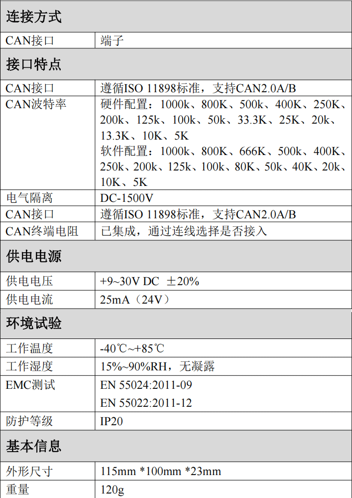 (1)PC接口符合USB2.0全速規(guī)范,兼容USB1.1及USB3.0;(2)集成2路CAN總線接口,使用鳳凰端子接線方式;(3)支持CAN2.0A和CAN2.0B幀格式,符合ISO/DIS 11898規(guī)范;(4)CAN總線通訊波特率在5kps~1Mbps之間任意可編程;(5)CAN總線自帶120Ω終端電阻,可通過連線接入;(6)CAN總線接口采用電氣隔離,隔離模塊絕緣電壓:DC 1500V;(7)總線自動(dòng)復(fù)位;(8)使用外接電源(DC 9-30V);(9)供電電流:25mA;(10)最高接收數(shù)據(jù)流量:14000 fps;(11)工作溫度范圍:-40℃~+85℃;