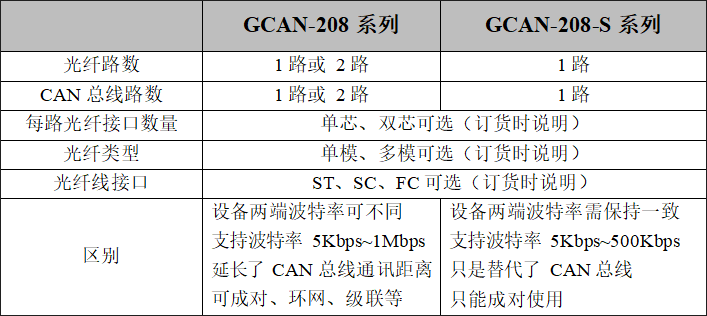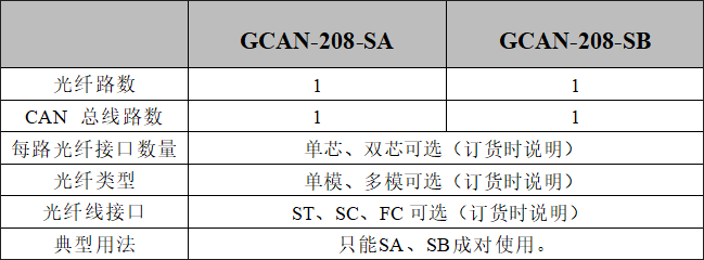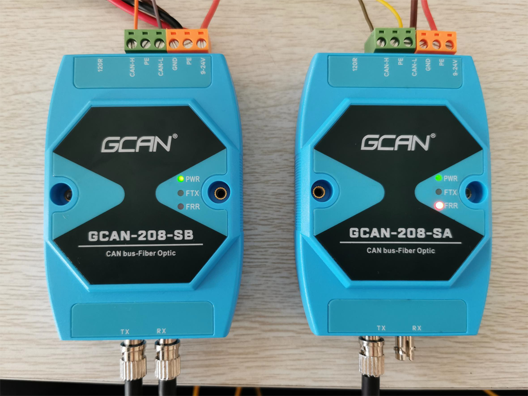請注意:GCAN-208-S系列模塊需要遠(yuǎn)端的CAN設(shè)備本身做CAN應(yīng)答,因此光纖總長度(第一臺設(shè)備到最后一臺設(shè)備之間的光纖,或者說全部光纖加起來)是13公里,超過13公里需要加CAN中繼器。(備注:當(dāng)前13公里是按照CAN波特率5K進(jìn)行計(jì)算,如果大于5K就會不到13公里)。4、與光纖連接