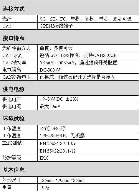 (1)使用外接電源供電(DC+9~30V±5%);(2)工作溫度范圍:-40℃~+85℃;(3)工作濕度范圍:15%~95%RH無凝露;(4)集成1路CAN總線接口,使用端子接線方式;(5)CAN總線信號包括:CAN_H、CAN_L、EARTH;(6)CAN總線自帶120Ω終端電阻,可通過撥碼開關(guān)選擇;(7)CAN總線支持CAN2.0A和CAN2.0B幀格式,符合ISO/DIS 11898規(guī)范;(8)CAN總線通訊波特率在5Kbps~500Kbps之間可通信;(9)CAN總線接口采用電氣隔離,隔離模塊絕緣電壓:DC 3000V;(10)光纖接口SC、ST、FC可選;(11)光纖傳輸模式單模、多??蛇x;(12)光纖數(shù)量單芯、雙芯可選。1、208-1接線