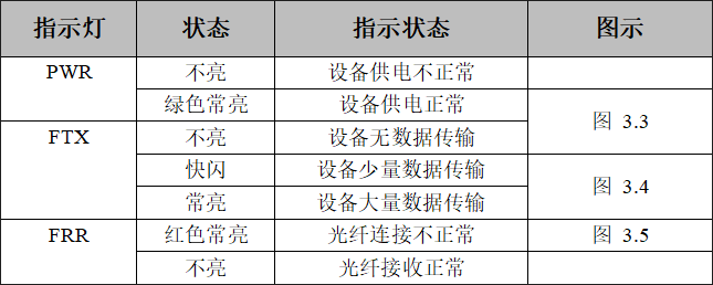 GCAN-208-S系列模塊具有1個PWR指示燈用來指示系統(tǒng)供電情況,1個FTX指示燈用來指示光纖數(shù)據(jù)傳輸,1個TX指示燈用來指示總線數(shù)據(jù)錯誤。這5個指示燈的具體指示功能見下表,這5個指示燈處于各種狀態(tài)的含義如表所示。GCAN-208-S系列模塊指示燈