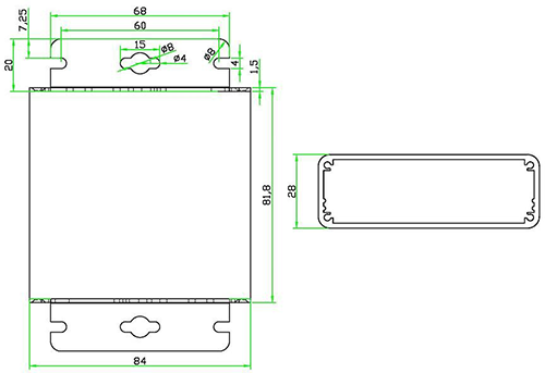 設(shè)備外形尺寸:(長(zhǎng))82mm*(寬)84mm*(高)28mm,其示意圖及安裝固定孔如圖所示。