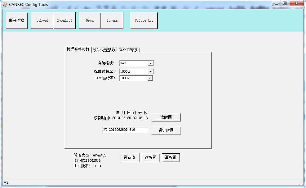 CAN總線數(shù)據(jù)存儲(chǔ)器已經(jīng)集成了系統(tǒng)時(shí)鐘,真實(shí)、準(zhǔn)確的系統(tǒng)時(shí)鐘及文件系統(tǒng)使模塊可以按天存儲(chǔ)并管理數(shù)據(jù),即每天按日期新建文件夾,將當(dāng)天存儲(chǔ)的數(shù)據(jù)自動(dòng)的存入對(duì)應(yīng)的文件夾中。模塊會(huì)在當(dāng)天的文件夾中每分鐘新建一個(gè)文件,將這一分鐘收到的數(shù)據(jù)保存到對(duì)應(yīng)的文件中。如模塊出廠時(shí)間不準(zhǔn)確則需要用戶自行校對(duì)系統(tǒng)時(shí)間,系統(tǒng)時(shí)間界面如圖所示,可以通過點(diǎn)擊讀時(shí)間按鍵,來讀取設(shè)備的系統(tǒng)時(shí)間,修改設(shè)定時(shí)間前的參數(shù)修改為:“NT=XXX”。舉例:發(fā)送“NT=20190626094616”,則會(huì)將系統(tǒng)時(shí)間修改為2019年6月26日09時(shí)46分16秒,點(diǎn)擊設(shè)定時(shí)間。