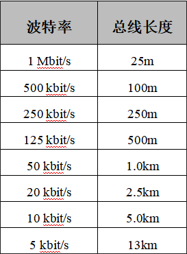 注意:CAN電纜可以使用普通雙絞線、屏蔽雙絞線。理論最大通信距離主要取決于總線波特率,最大總線長(zhǎng)度和波特率關(guān)系詳見表。若通訊距離超過1Km,應(yīng)保證線的截面積大于Φ1.0mm2,具體規(guī)格應(yīng)根據(jù)距離而定,常規(guī)是隨距離的加長(zhǎng)而適當(dāng)加大。