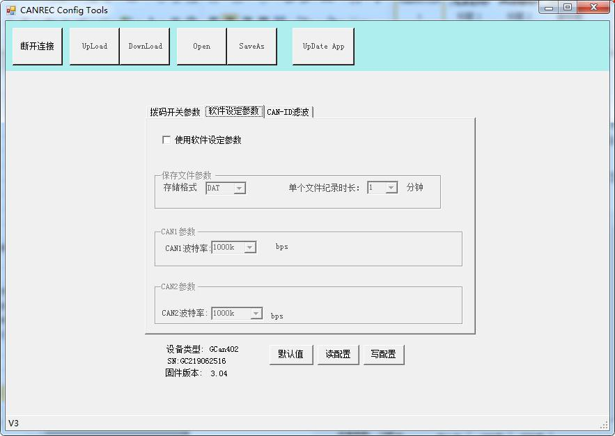 軟件配置參數(shù)界面如圖所示,用戶可以通過圖3.3所示的界面,讀取設(shè)備撥碼開關(guān)設(shè)定的參數(shù),勾選使用軟件設(shè)定參數(shù)之后生效,GCAN-402D模塊支持20k-1000k全范圍波特率,CAN總線數(shù)據(jù)存儲(chǔ)器支持四種保存數(shù)據(jù)格式:二進(jìn)制文件(.DAT)、文本文件(.TXT)、Vector軟件可導(dǎo)入文件(.ASC)、批處理文件(.CAN),GCAN-402D默認(rèn)是每分鐘新建一個(gè)文件,將這一分鐘收到的數(shù)據(jù)保存到對(duì)應(yīng)的文件中,可以通過修改單個(gè)文件記錄時(shí)長(zhǎng)修改單個(gè)文件保存的數(shù)據(jù)時(shí)間。軟件配置參數(shù)設(shè)置