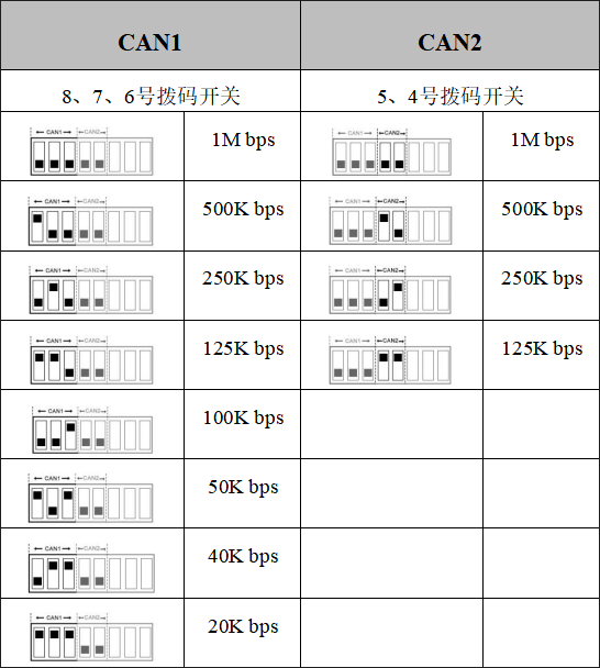 系統(tǒng)先不要上電,撥碼開關(guān)的“8、7、6、5、4”號(hào)可以分別對(duì)CAN1和CAN2波特率進(jìn)行配置,端子1有特殊定義,默認(rèn)朝上,請(qǐng)勿隨意設(shè)置。撥碼開關(guān)向上默認(rèn)為0,向下為1(ON),具體各波特率說明如表所示。