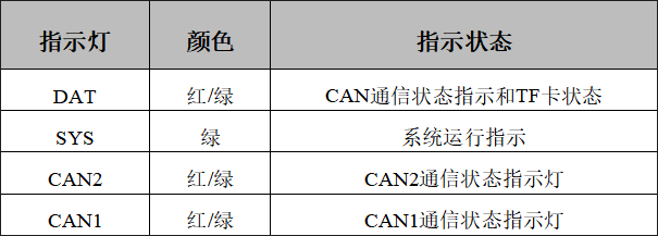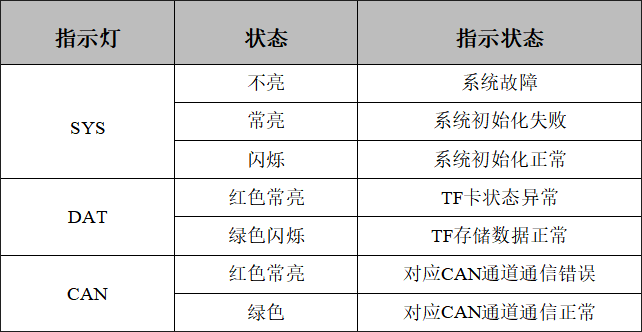 CAN總線數(shù)據(jù)存儲(chǔ)器具有1個(gè)SYS指示燈用來指示系統(tǒng)運(yùn)行狀態(tài),1個(gè)DAT指示燈用來指示CAN總線數(shù)據(jù)傳輸和TF卡狀態(tài)。2個(gè)CAN指示燈用來指示CAN總線數(shù)據(jù)傳輸狀態(tài)。這2個(gè)指示燈的具體指示功能見下表,這2個(gè)指示燈處于各種狀態(tài)的含義如下表所示。